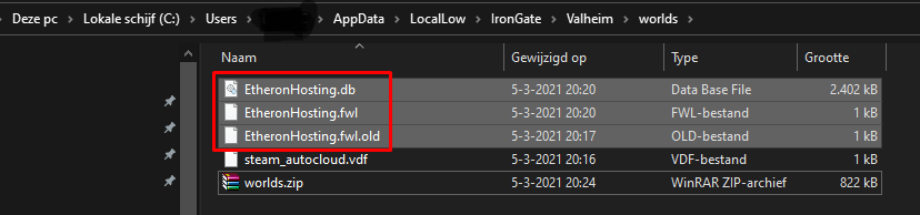Eerst heb je jouw bestaande wereld nodig. Deze vind je standaard bij C:\Users(Computer Gebruikersnaam)\AppData\LocalLow\IronGate\Valheim\worlds