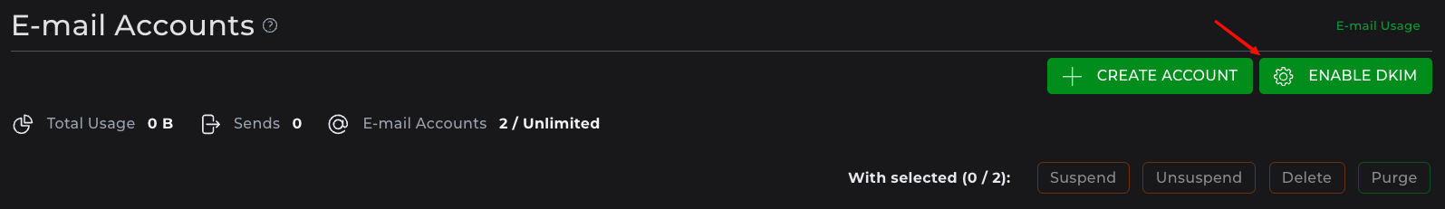 - Ga naar E-Mail Accounts → ENABLE DKIM