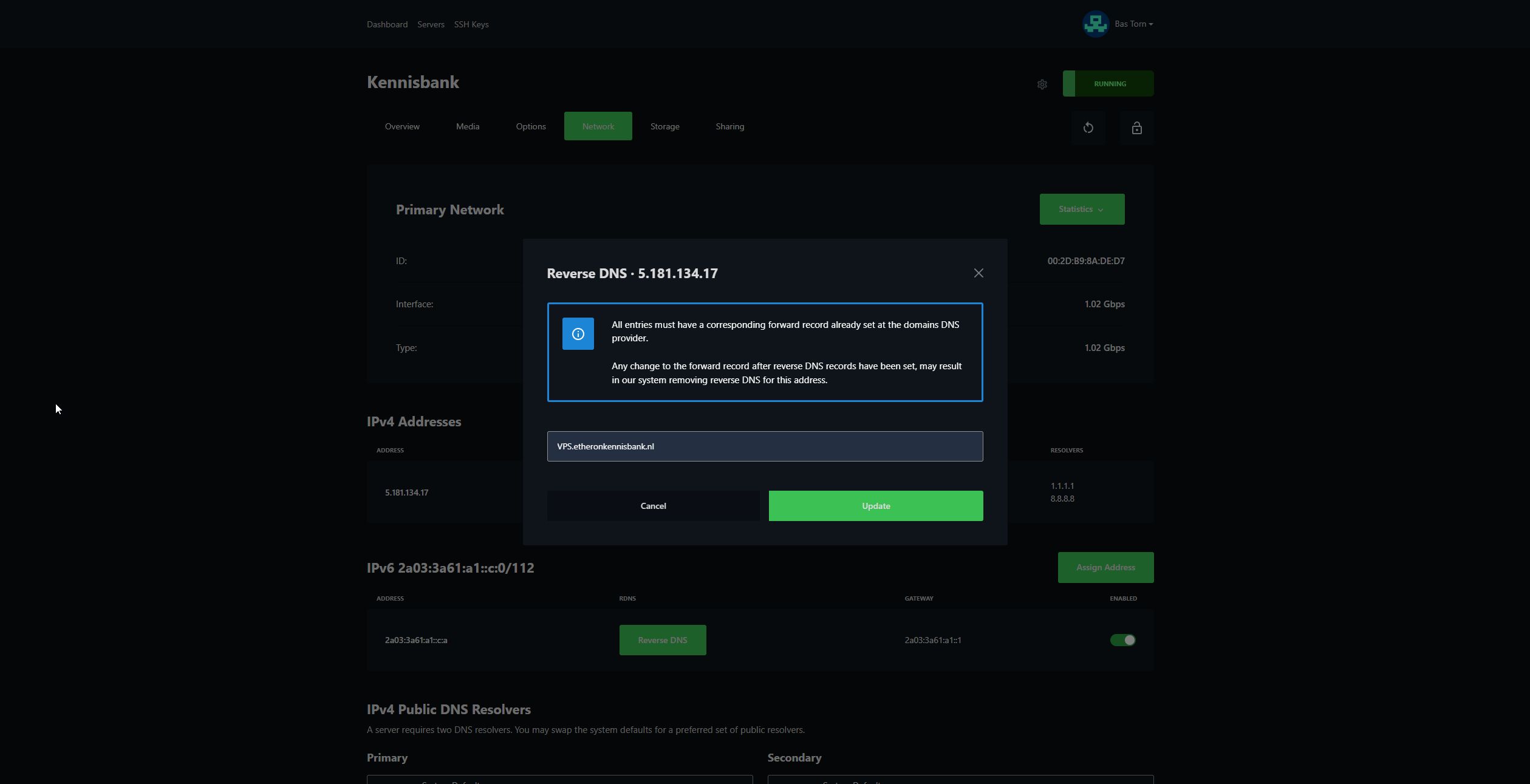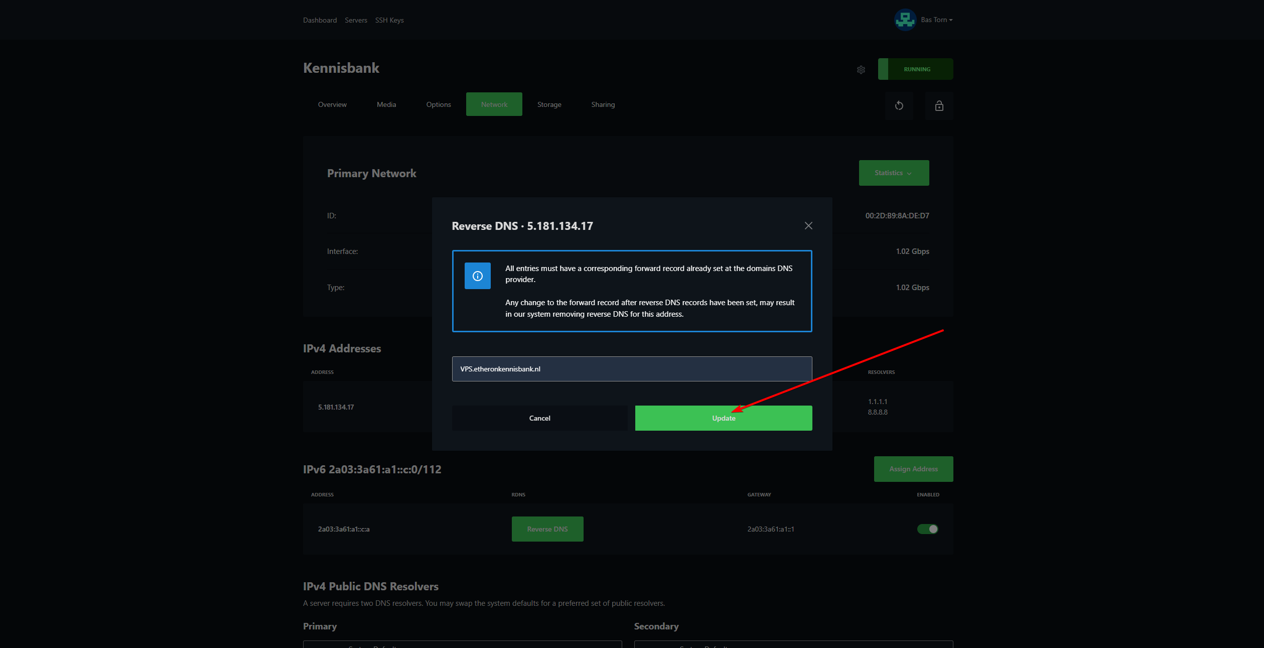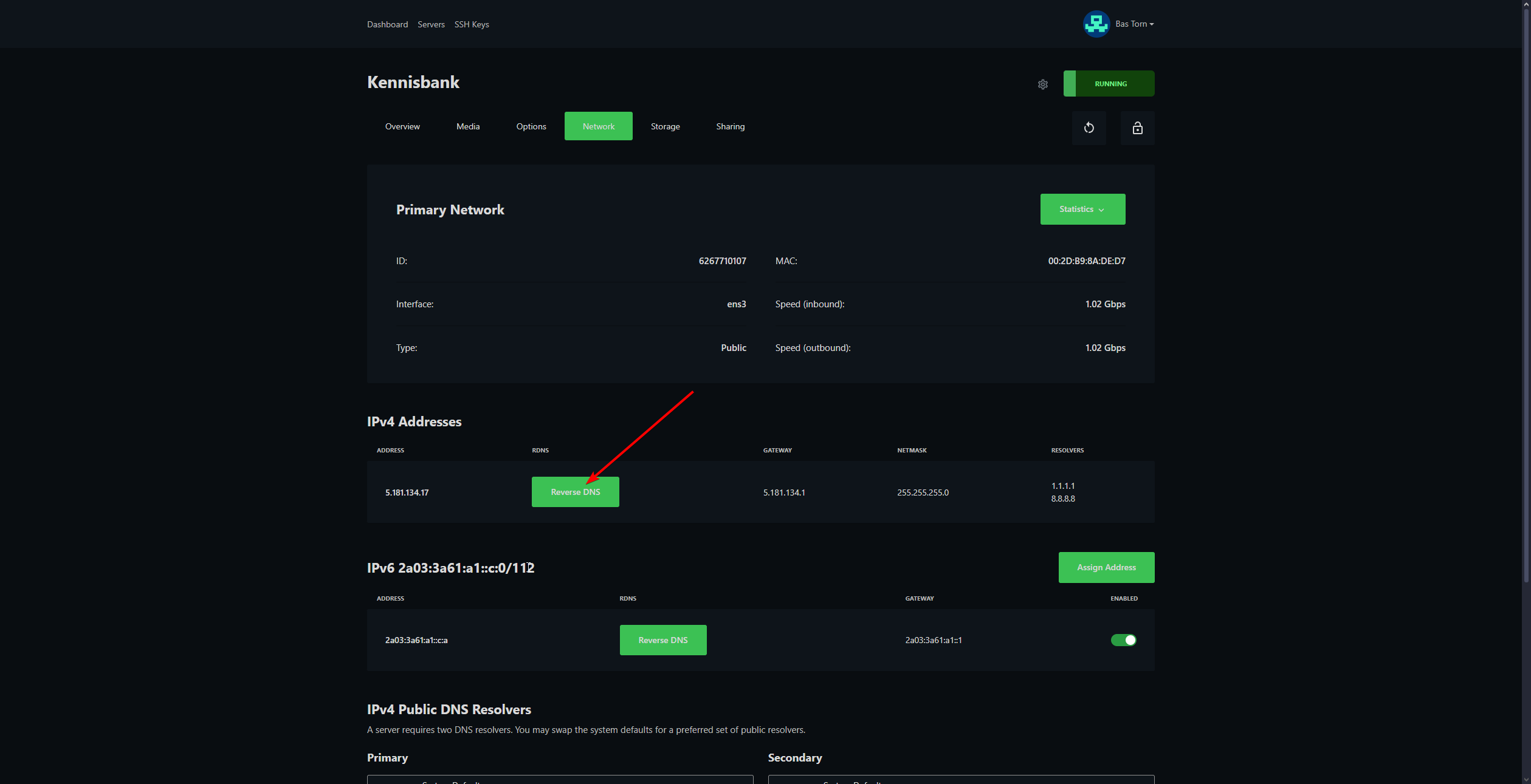 - Klik bij IPv4 (of IPv6 indien je dat fijner vindt) op de groenen **Reverse DNS **knop.