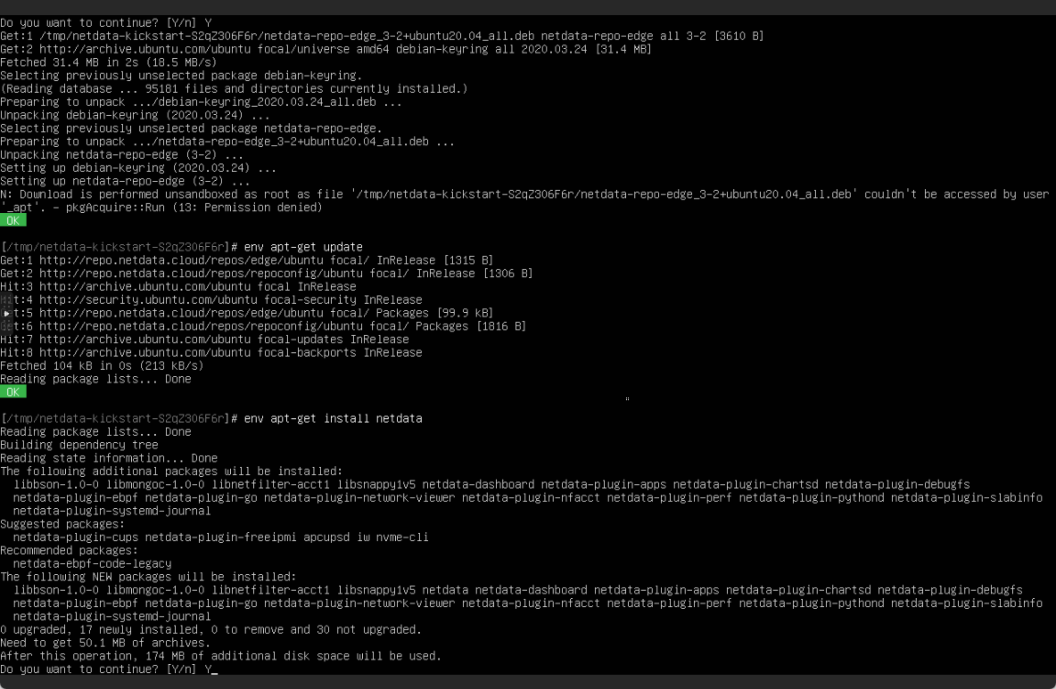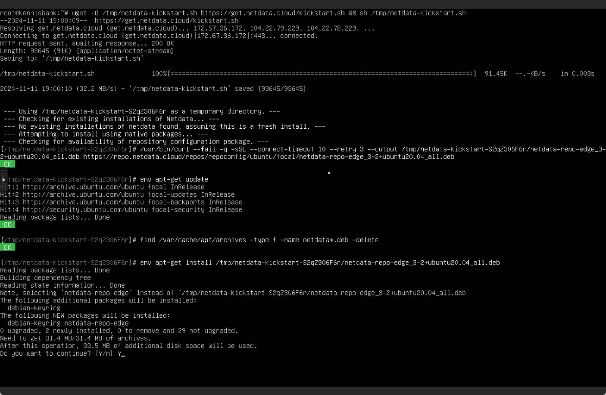 - Type nu **wget -O /tmp/netdata-kickstart.sh https://get.netdata.cloud/kickstart.sh && sh /tmp/netdata-kickstart.sh **in je console van je VPS en druk hierna op ENTER op je toetsenbord.