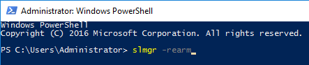 - Typ in powershell: slmgr -rearm en druk op ENTER