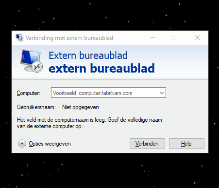 Vul alle gegevens in die nodig zijn om te verbinden. Vul achter Computer: het ip-adres in van je VPS. De gebruikersnaam is altijd Administrator.
