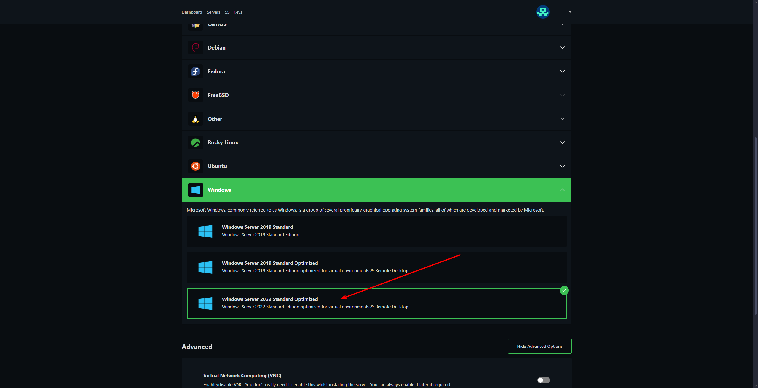 - Klik op Advanced Options en zet VNC aan. Dit is handig voor het gebruiken van windows aangezien Remote Desktop niet aanstaat.
