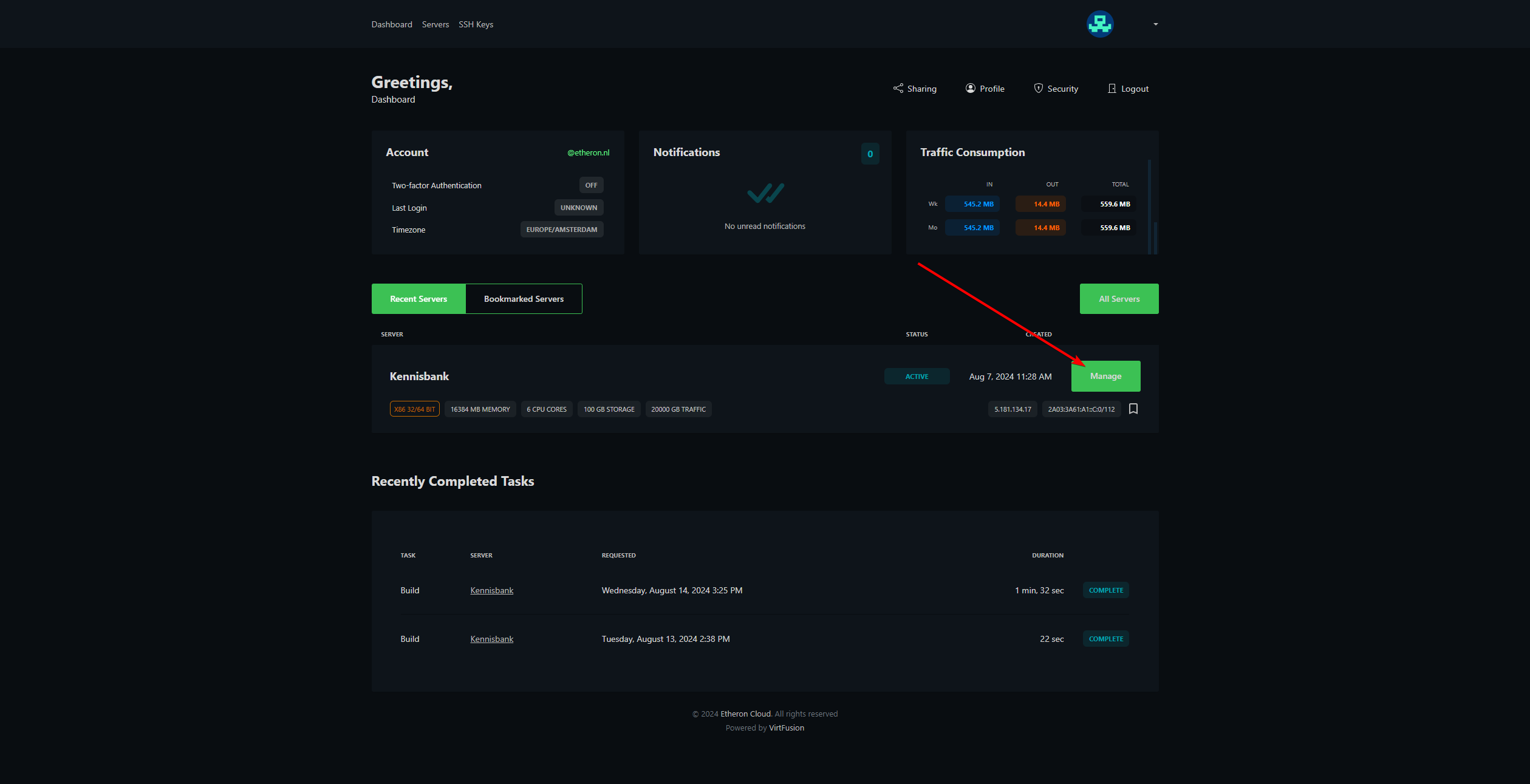 Klik op **Manage **bij de gewenste VPS.