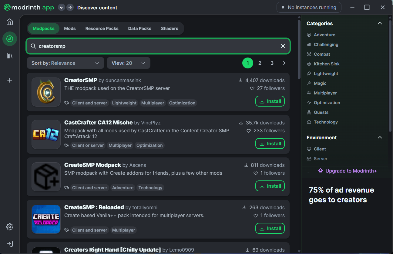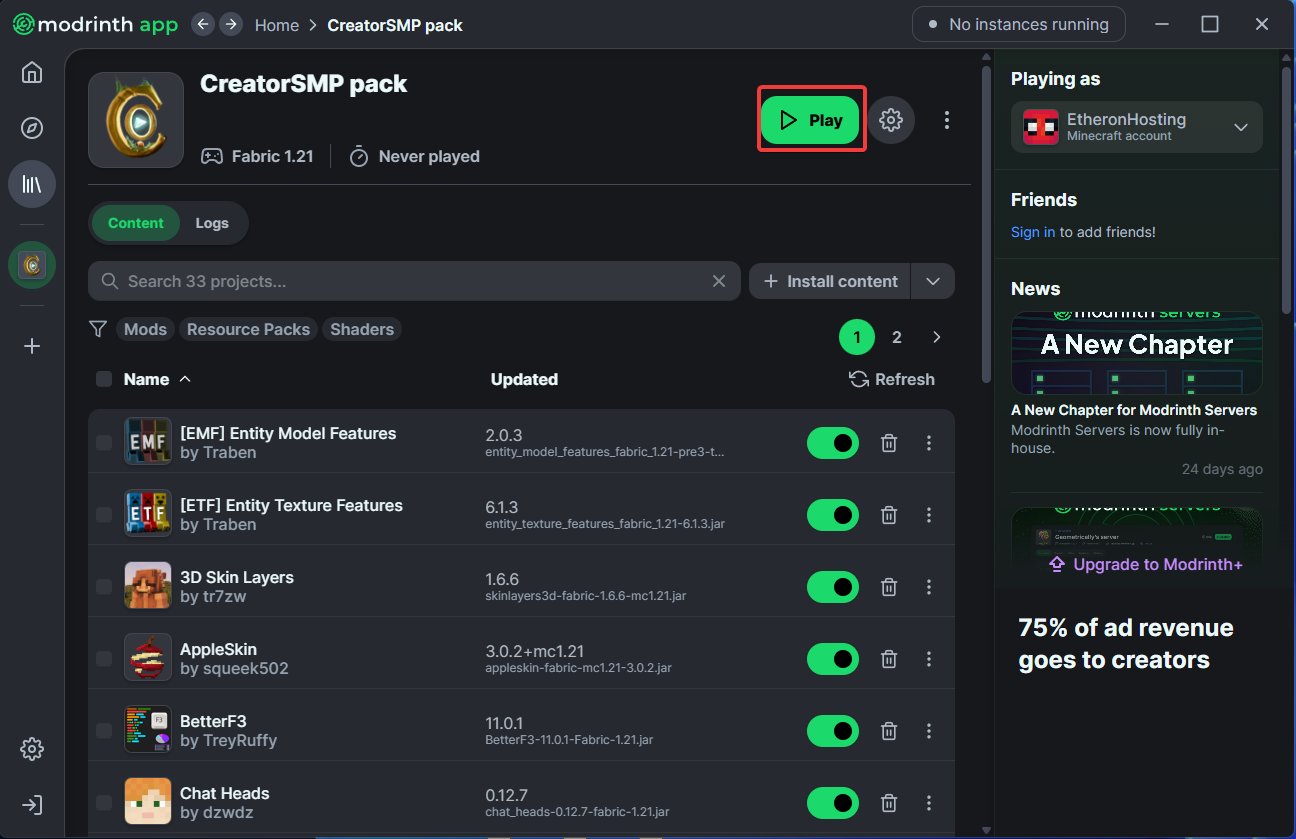 - Nu download je de modpack creatorsmp let op de versie moet het zelfde zijn als op de server!