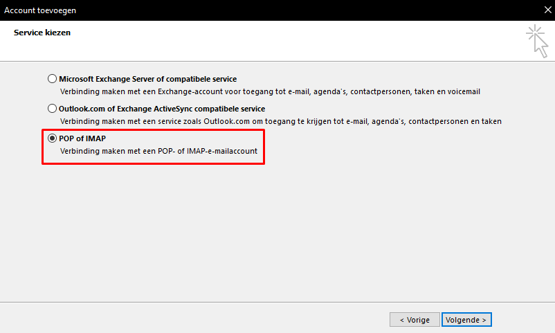 - In het volgende venster staan meerdere services. In dit geval maken we gebruik van **IMAP **dus gaan we voor de onderste optie.