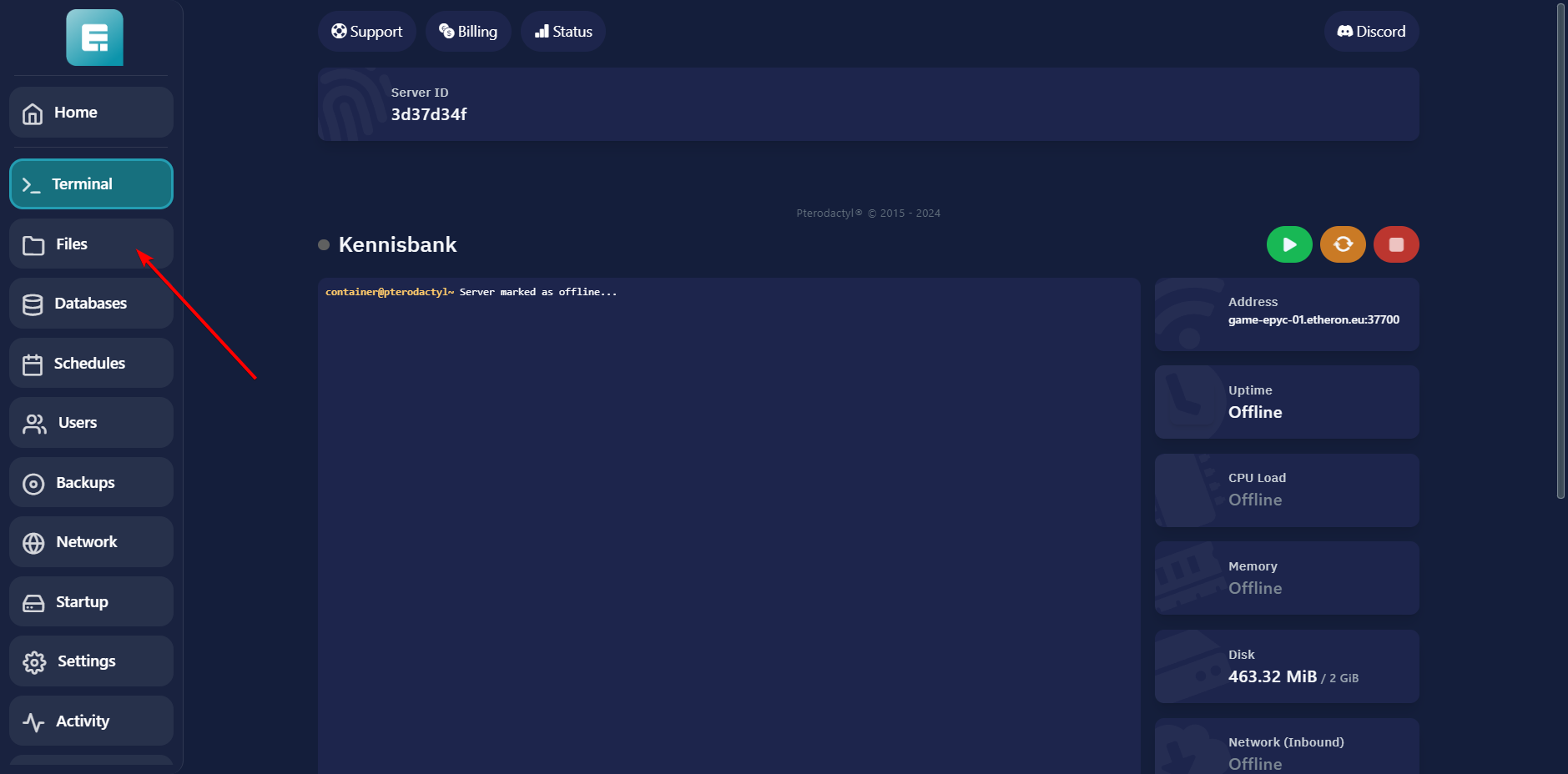 Zet de server uit door op de rode knop te klikken.