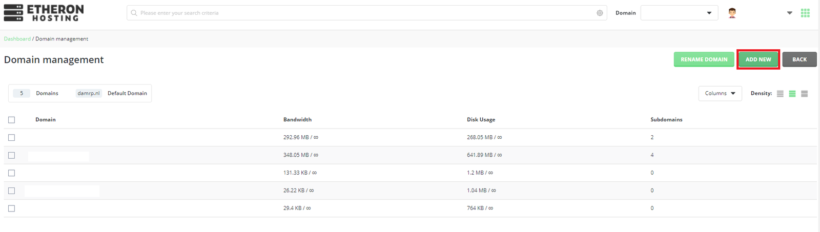- Klik rechtsboven op Add new om een domeinnaam toe te voegen